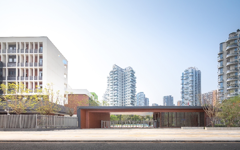 为充分利用土地,设计将教学区沿用地周边的南,北,东三个边界以“两横一纵”布局布置,西侧设底层架空的风雨操场,形成面向西侧运动场的开口,“两横”主要布置普通教室组团,通过“一纵”的专用教室组团串联起普通教室组团。建筑造型采用现代建筑语言及体量组合,强调整体、统一的形式感,打造学校完整的对外形象。校园内则在统一中寻求自由活泼的变化,利用楼梯、花池、架空活动区、趣味的坡道、优美的庭院,强调静与动、统一与变化的对比,以此促进多种学习、生活交流的产生。完整建筑形体、精心的细部设计等建筑元素一起,体现着浓郁的文化氛围和朝气蓬勃的学校气质。