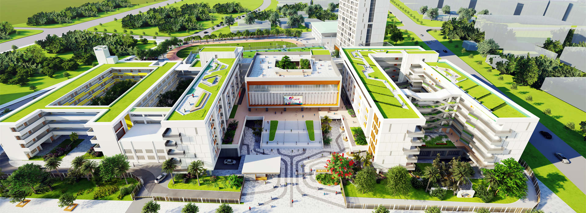 原校园在拆除部分破旧危楼建筑后,保留的建筑在红线内呈对角布局,且操场位置保留不变,导致可扩建用地不规则,扩建用地容积率高达3.0。原校园规划分别在场地北侧和西侧道路开设出入口,有着较清晰的十字形的校园脉络关系,因此扩建建筑延续此脉络结构,主体教学楼亦延续原教学楼合院式布局,通过建筑空间语言营造十字共享主轴,形成中小学部分区、功能立体复合的特色校园空间。