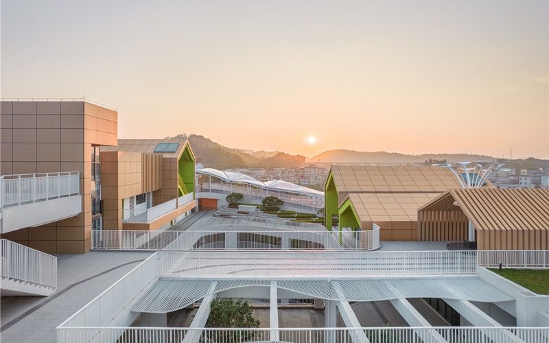 由趣味连续的坡道,梯田式平台,丰富多彩的绿化和特色功能的“木屋”等元素组成“叠顶田园空间”,串联了整个3-6层屋面和立面,屋面作为中小学活动空间既连续又相对独立,共同打造出舒适宜人的“田园绿洲”风光。 屋顶“木屋”的教学空间更是充满童话色彩,开放的空间,可用做多种功能使用,比如合班教室,地理科学园地,各种兴趣活动等等。屋面部分景观被改造成学生劳作课的实践基地,寓教于乐,与丰富的种植系统共同形成良好的屋面绿化景观,为多样化的屋顶空间利用提供可能。