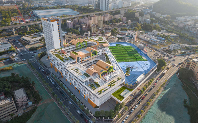 本项目位于坪山区,为45班九年一贯制学校,项目现状南侧为城中村,设计场地容积率3.0,高于一般校园建筑的设计要求,能否通过设计手段在极限用地和高容积率条件下,缝合儿童的成长空间序列。校园作为适应的儿童成长的容器,或许最应该弥补的是——自然。